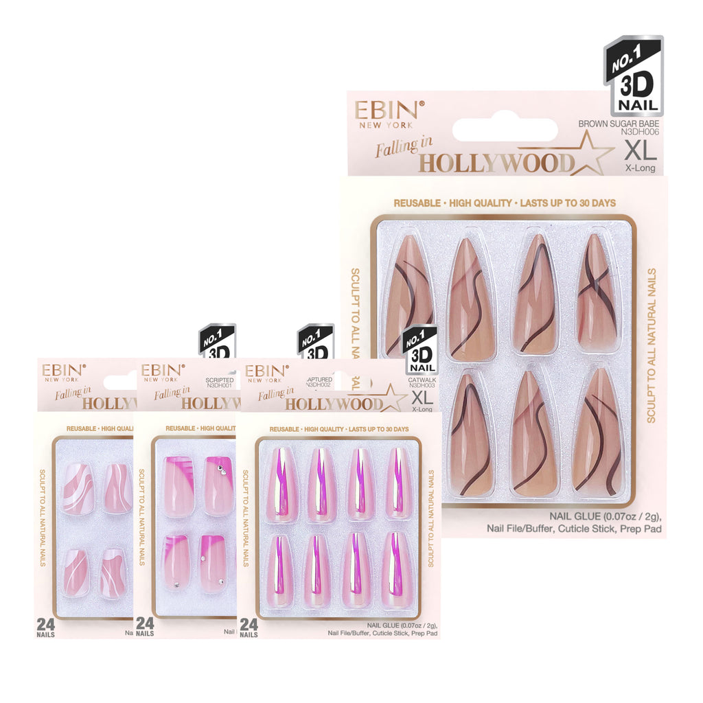 PREMIUM QUALITY Crafted from top-tier materials, Falling In Hollywood press-on nails are both safe and durable. The high-quality materials ensure that your nails maintain their stunning appearance throughout wear. Includes 24 nails, glue, nail file, prep pad, and a cuticle stick. Easy and quick application and removal without the hassle.